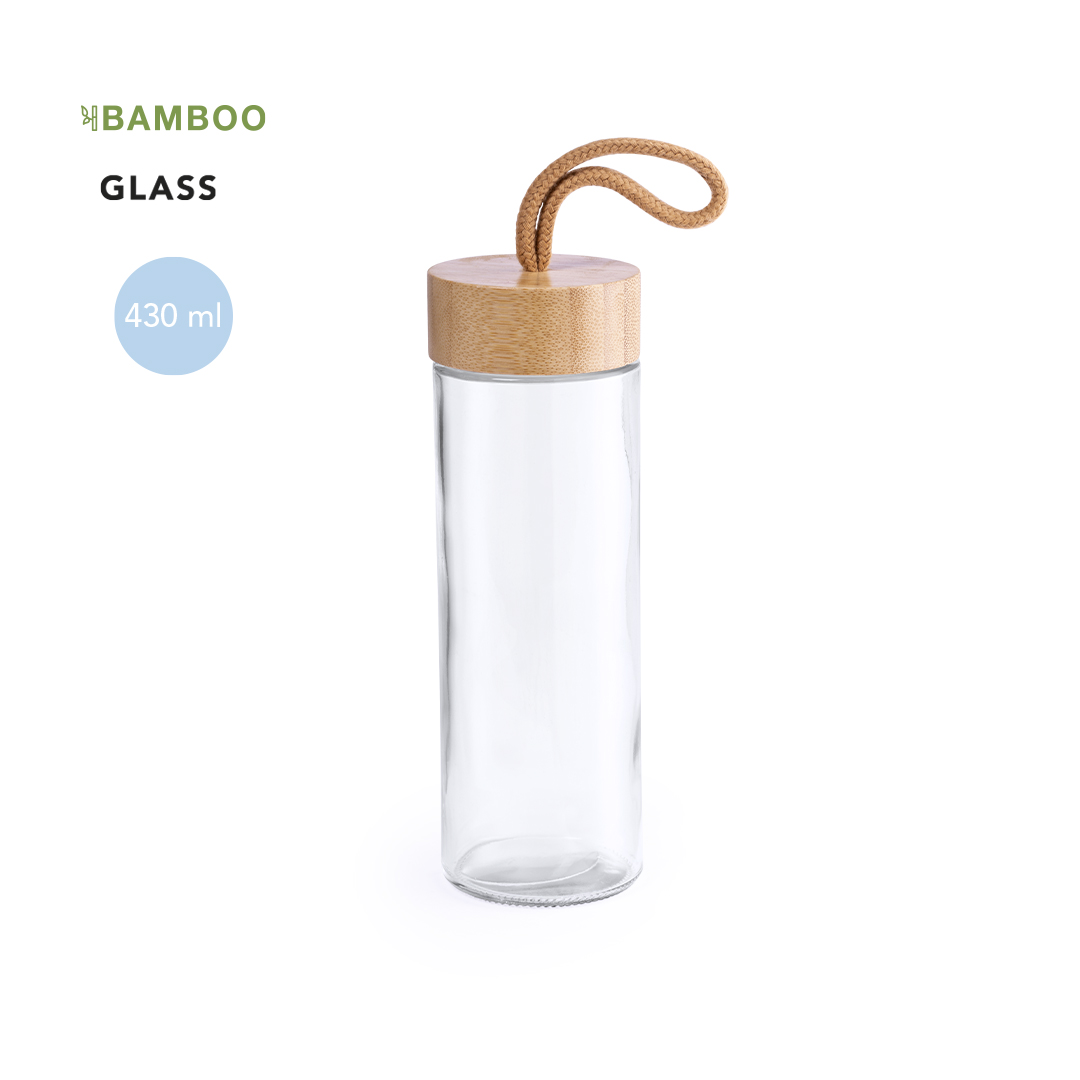 Tarro de línea nature de 420ml de capacidad. Fabricado con cuerpo de cristal y tapón a rosca de bambú, con práctica asa de transporte trenzada en color natural. Presentado en caja individual de atractivo diseño.