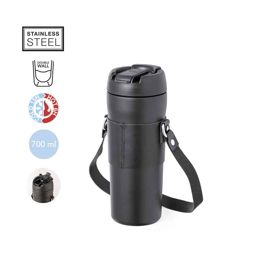 Descubre el bidón térmico Matner, un regalo corporativo perfecto para promocionar tu marca. Con una capacidad de 700 ml, este elegante artículo publicitario está fabricado en acero inoxidable de doble pared, ideal para mantener tus bebidas a la temperatura perfecta. Su innovador tapón a rosca incluye un dosificador y boquilla para pajita, además de un cómodo asa de transporte con agarrador de polipiel. Presentado en una atractiva caja individual de diseño kraft, es el merchandising promocional que tu empresa necesita para destacar en eventos y reuniones.
