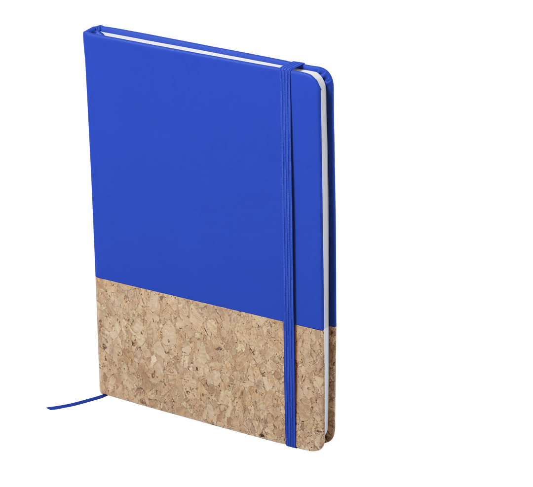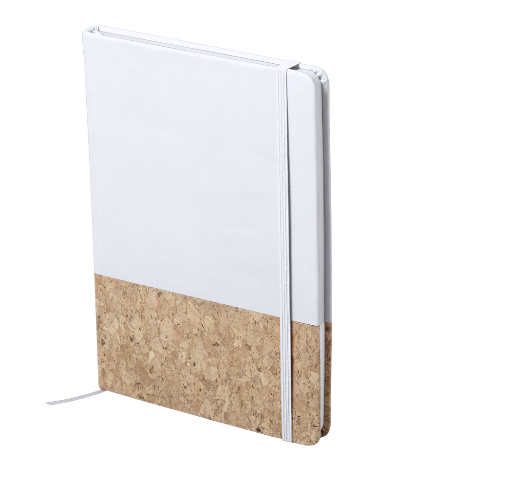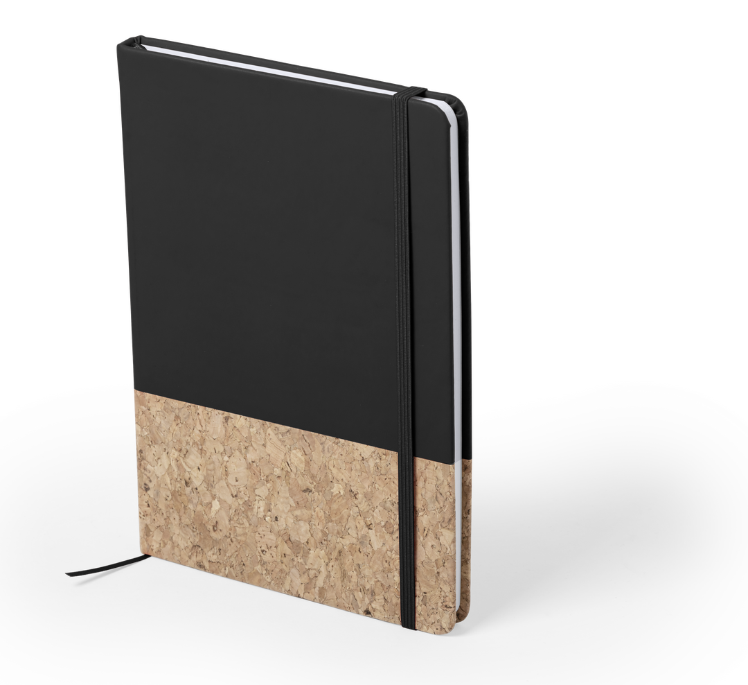 Bloc de notas de línea nature en combinación de corcho natural con polipiel de tapas rígidas. Con 100 hojas lisas con acabado natural, elástico de sujeción y marcapáginas de tela a juego. Disponible en variada gama de colores.