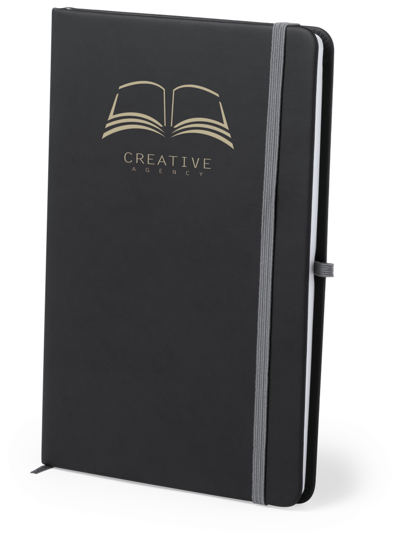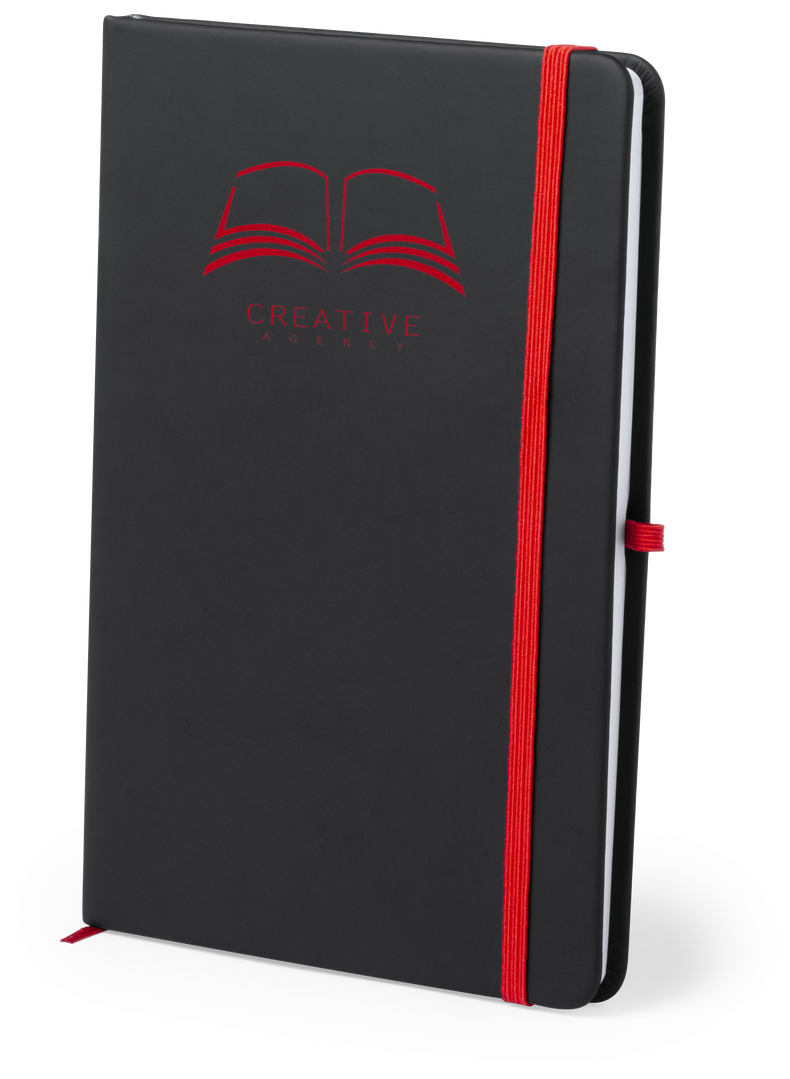 Bloc de notas con tapas de suave tacto acabadas en polipiel. En elegante color negro, con elástico de cierre, marcapáginas y soporte elástico para bolígrafo en vivos colores. Recubrimiento exterior especialmente diseñado para marcaje en láser, con el que conseguirá que su publicidad o marca quede perfectamente grabada en color a juego con el del artículo. Incluye 100 hojas con disposición a una raya.