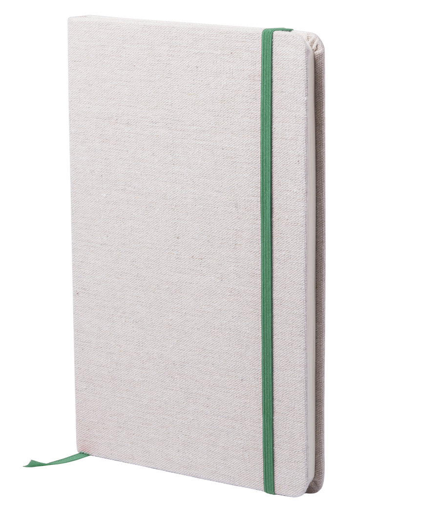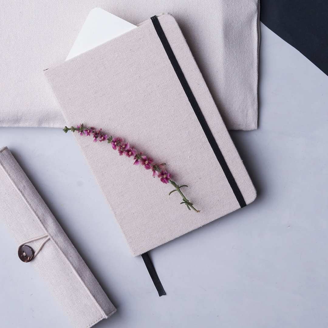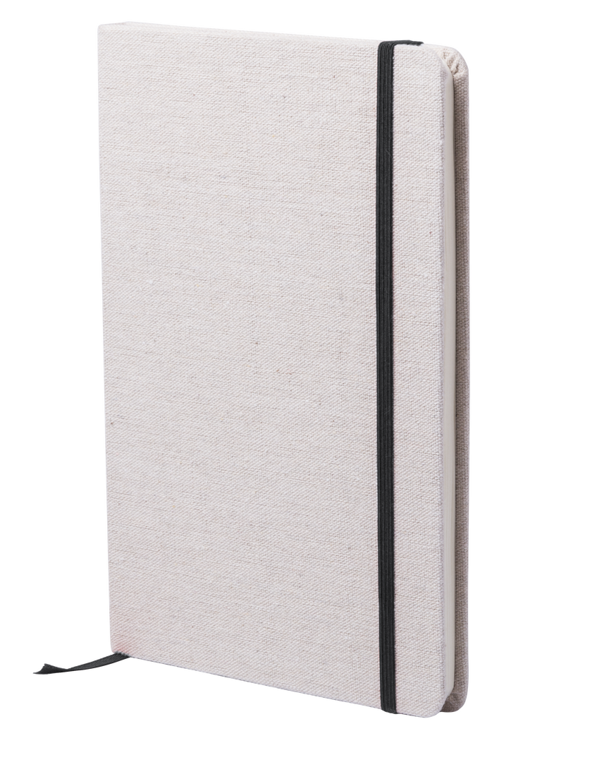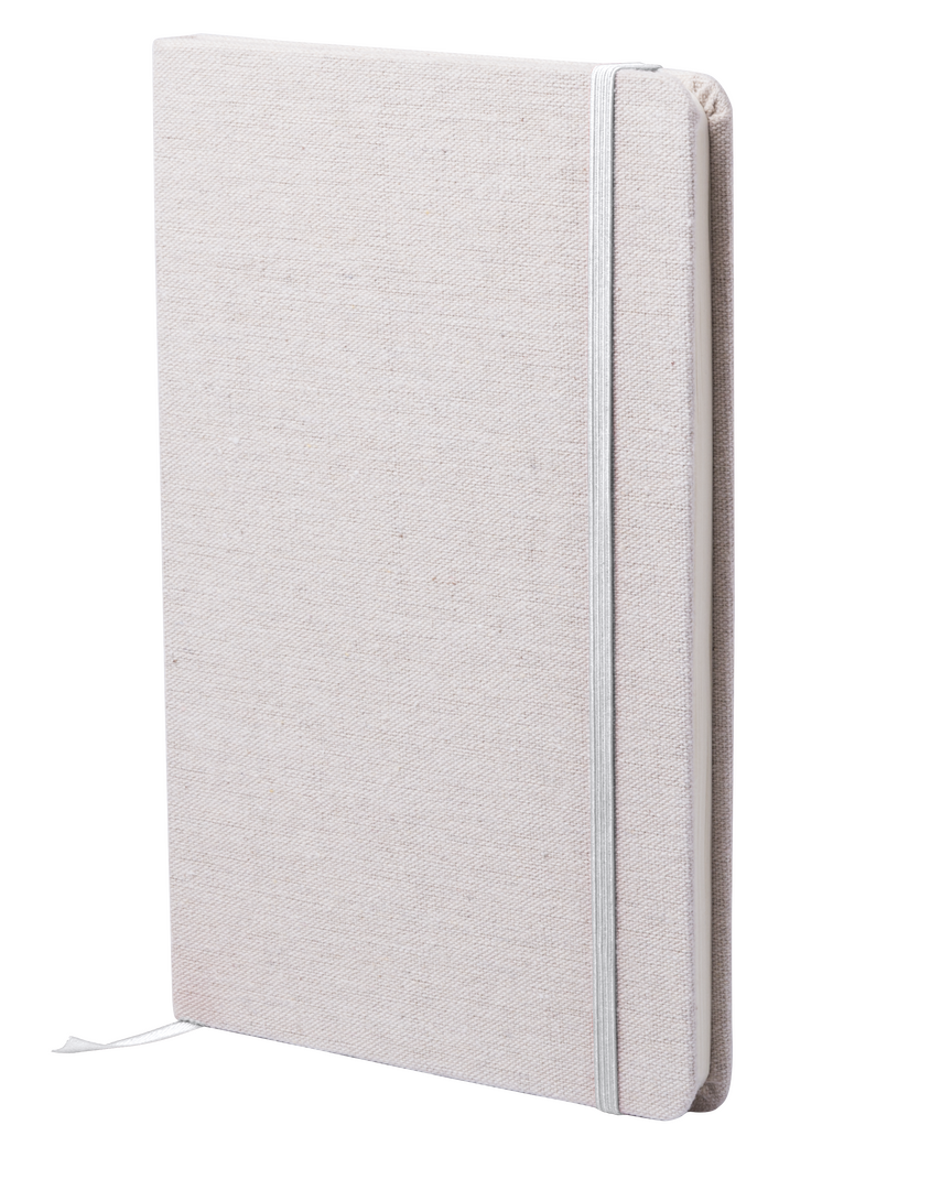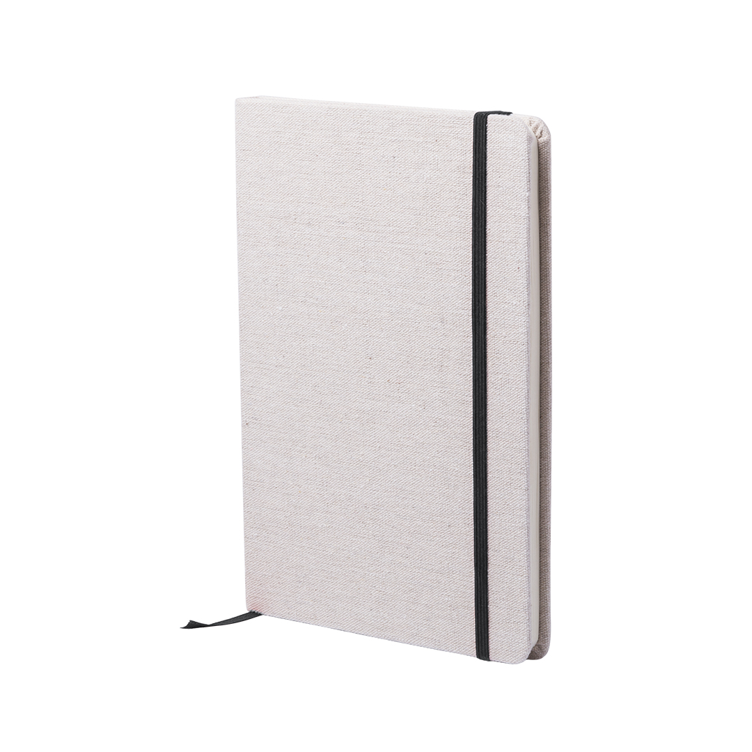 Bloc de notas de materiales naturales. Tapas en suave algodón de color crudo, con elástico de cierre y marcapáginas a juego en vivos colores. Incluye 80 hojas lisas.