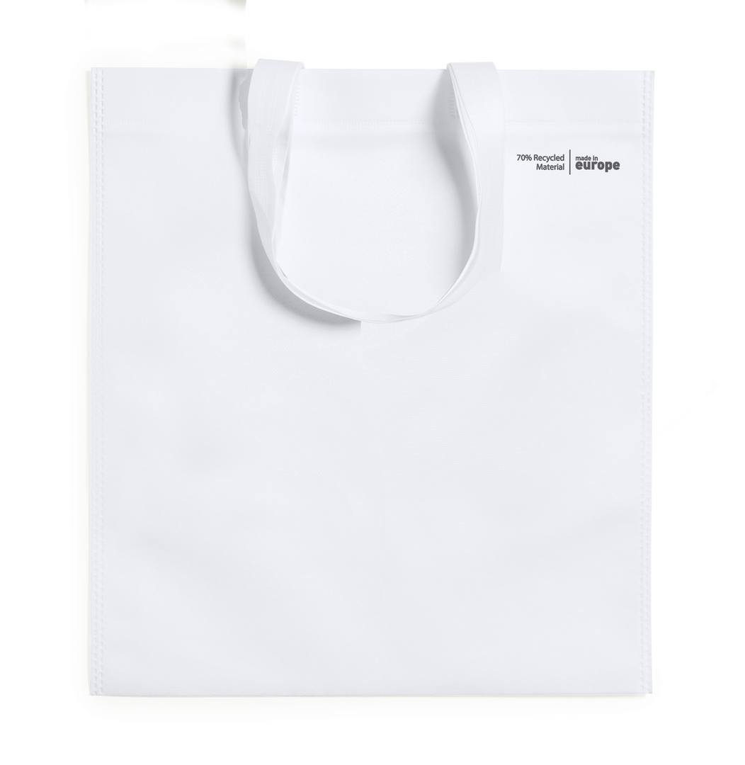 Bolsa de línea nature en non-woven reciclado de 70g/m2. De fabricación europea, con acabado termosellado, asas cortas y distintivo eco/made in sobre la bolsa.
