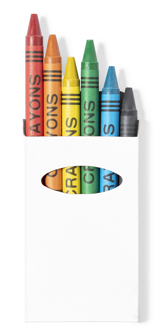 Set de 6 ceras en caja de cartón con acabado brillante en vivos colores y ventana. Con cuerpo cilíndrico en variados colores. En colores rojo, verde, amarillo, azul, negro, y naranja.
