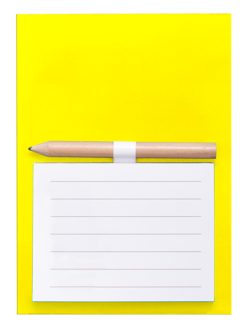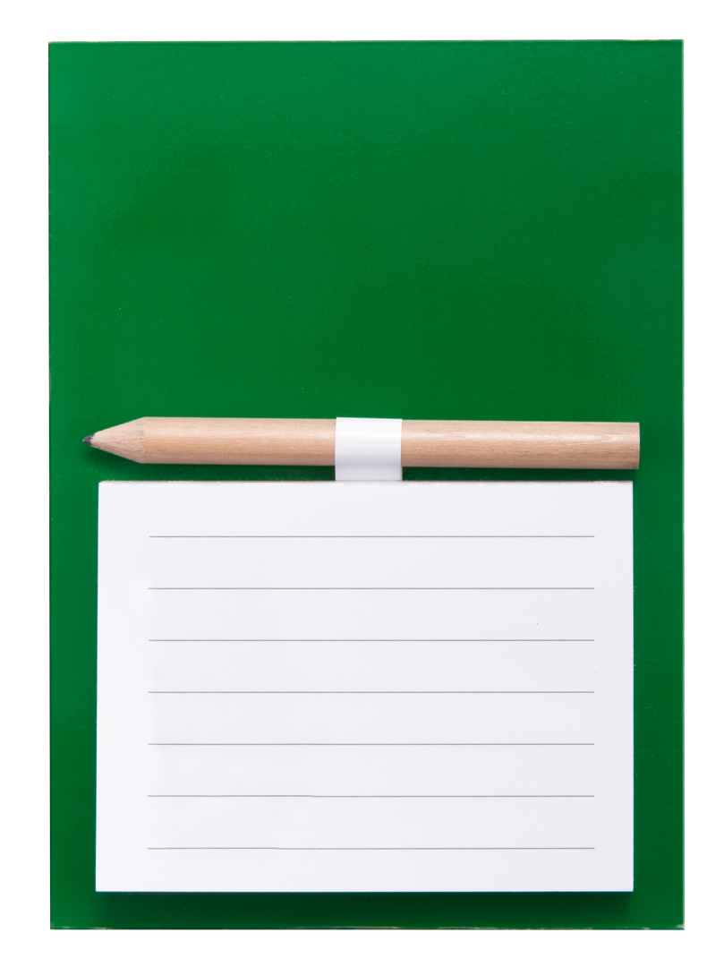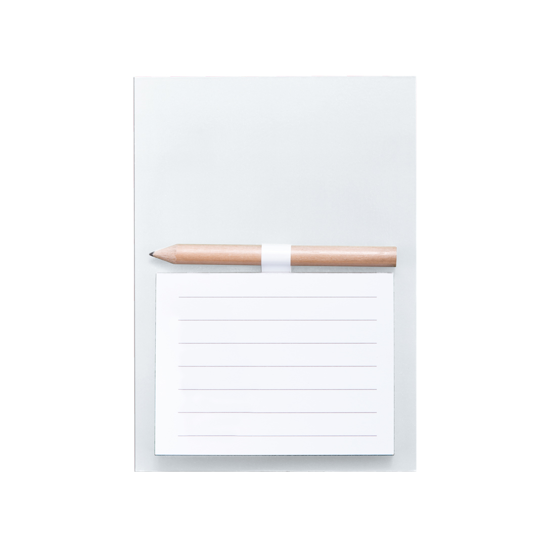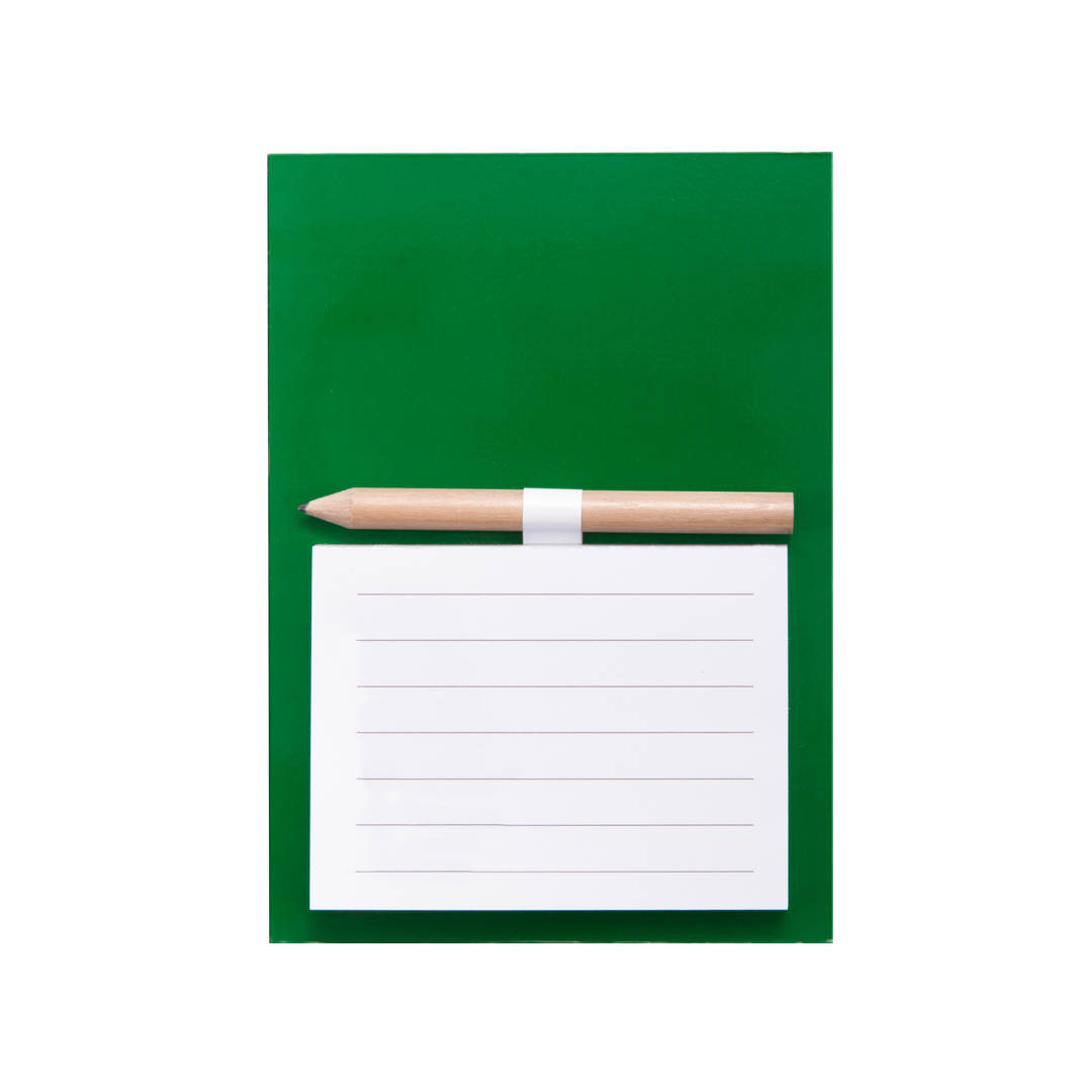 Imán bloc de notas en resistente cartón de vivos y variados colores. Bloc de 40 hojas de distribución a una raya con soporte para minilápiz -incluido-.
