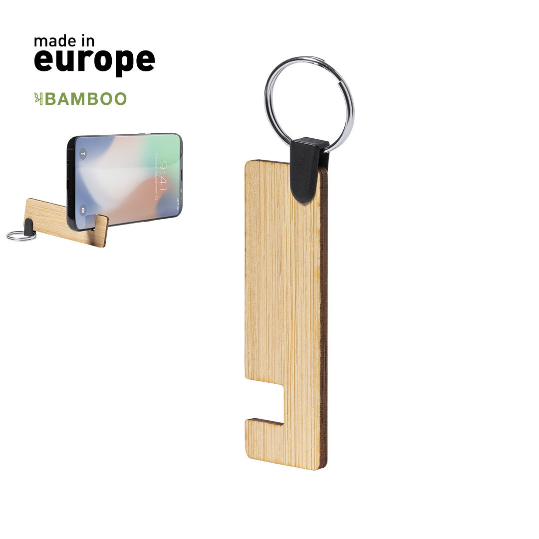Llavero soporte para smartphone y tablet de línea nature, hecho en bambú procedente de cortes naturales. De fabricación europea.