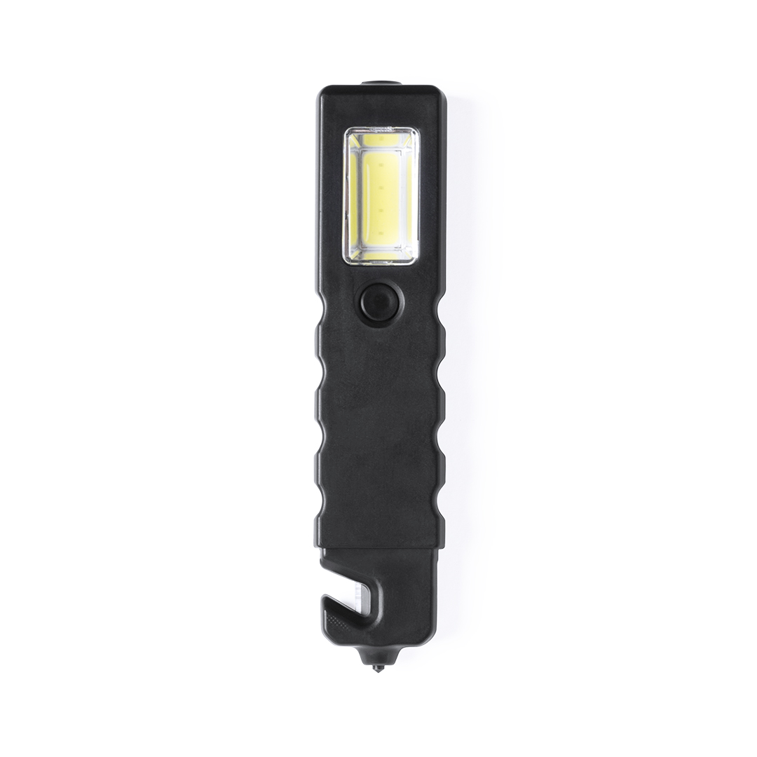 Martillo de emergencia 3 en 1 con linterna led y 4 luces COB con 3 modos de iluminación. Con superficie imantada y cuchilla corta cinturones.