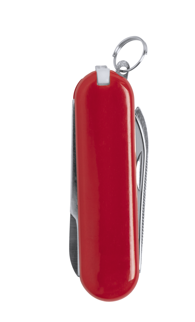 Mininavaja multiusos con accesorios de acero inox, de 6 funciones en variados colores. Incluye navajas, pinzas, lima, palillo, anilla para llavero y tijeras. Presentada en caja individual.
