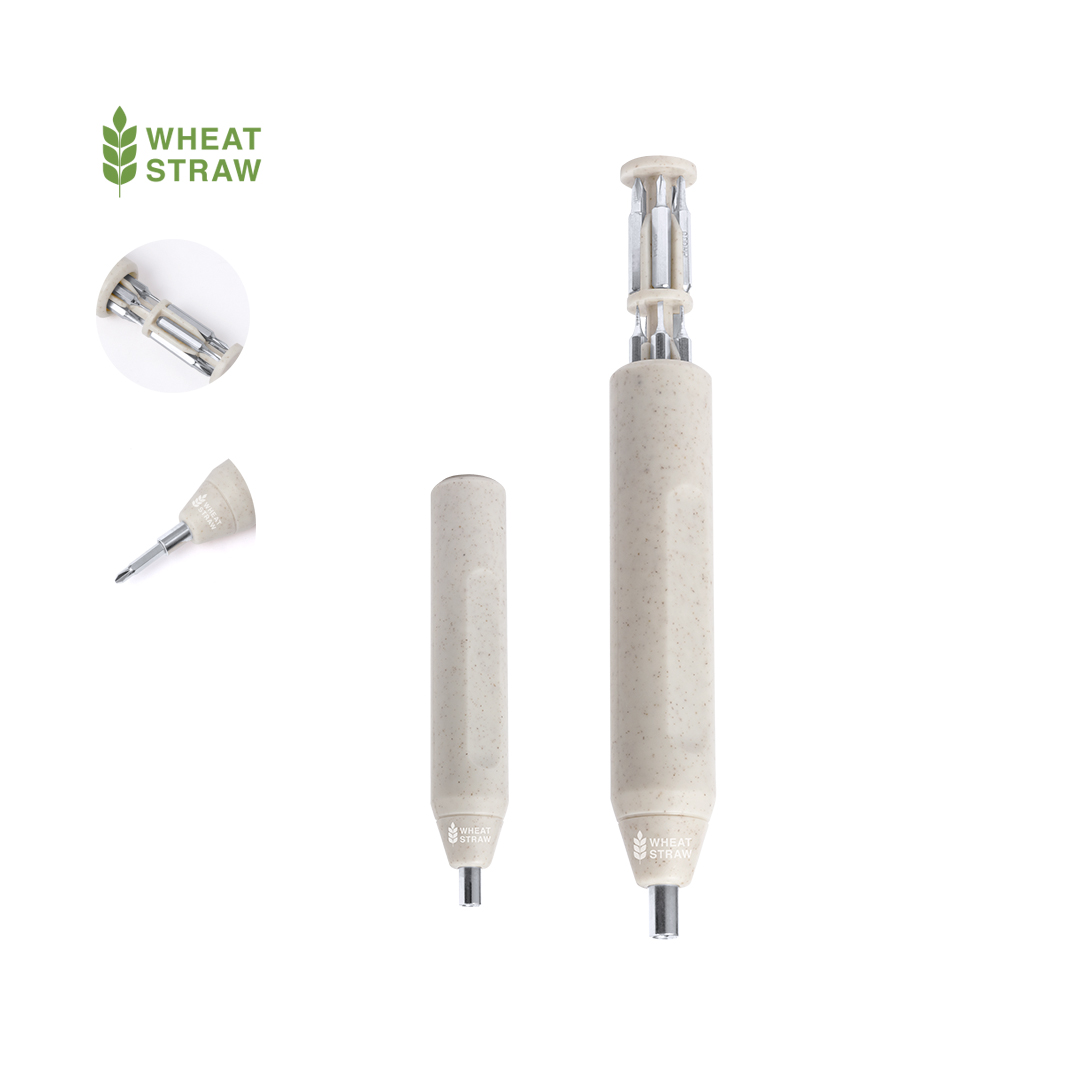 Descubre nuestra innovadora multiherramienta Sacana, un artículo promocional ideal para tu estrategia de merchandising. Fabricada con caña de trigo, este práctico destornillador incluye un compartimento para almacenar múltiples puntas magnéticas (planas y Philips). Personaliza este regalo corporativo con tu logotipo y preséntalo en una elegante caja de diseño kraft. Perfecto para reforzar la imagen de tu empresa mientras promueves la sostenibilidad.