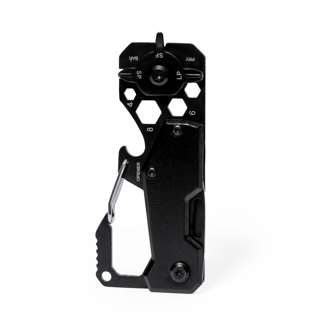 Descubre la multiherramienta Valixia, el regalo corporativo ideal para potenciar tu publicidad. Fabricada en aluminio y acero inoxidable con un elegante acabado negro, esta multiherramienta cuenta con 13 funciones esenciales: llave para tuercas hexagonales, mosquetón, abrelatas, regla, rasqueta, cuchillo y destornilladores planos y Philips. Presentada en una atractiva caja de diseño kraft, es el artículo publicitario perfecto para destacar tu marca y hacerla memorable.