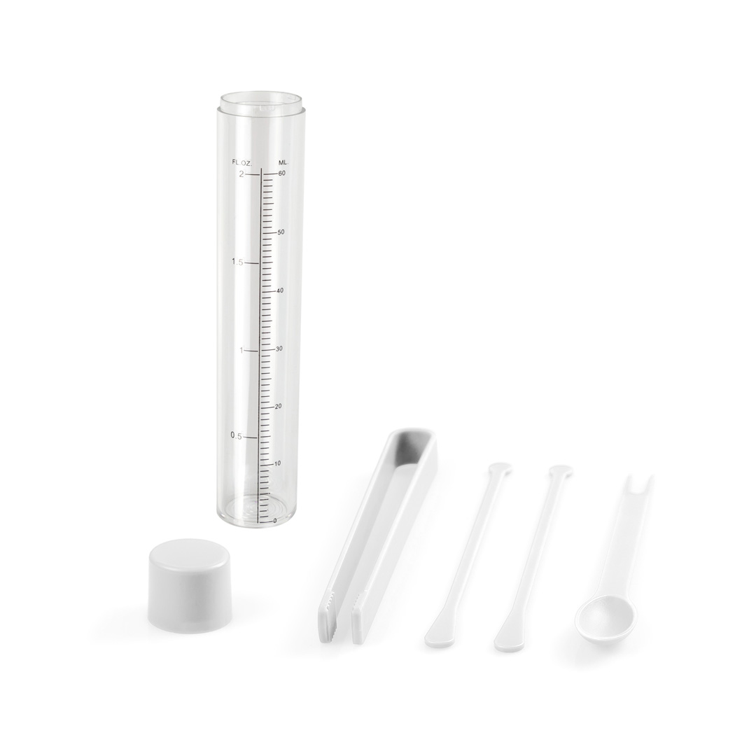 Set para cocktails de 5 accesorios en variada gama de vivos colores. Incluye envase medidor de 60ml de capacidad, cuchara trinchador, pinzas y dos agitadores.