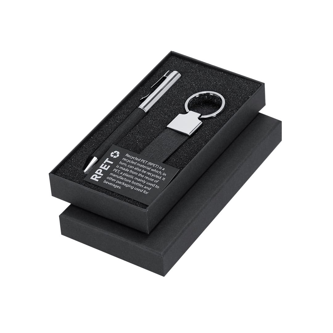 Descubre el elegante Set Jayon, confeccionado en RPET con un sofisticado acabado negro bitono y detalles metálicos que destacan su diseño moderno. Este set incluye un bolígrafo con mecanismo giratorio y tinta azul, junto con un llavero de estilo contemporáneo, ambos elaborados a partir de plástico reciclado. Presentados en un estuche individual negro, este regalo no solo es práctico, sino que también refleja un compromiso con la sostenibilidad. Ideal para empresas que buscan un regalo promocional que deje huella. Haz clic en el botón Comprar con Impresión para ver las opciones de marcado y personalización.
