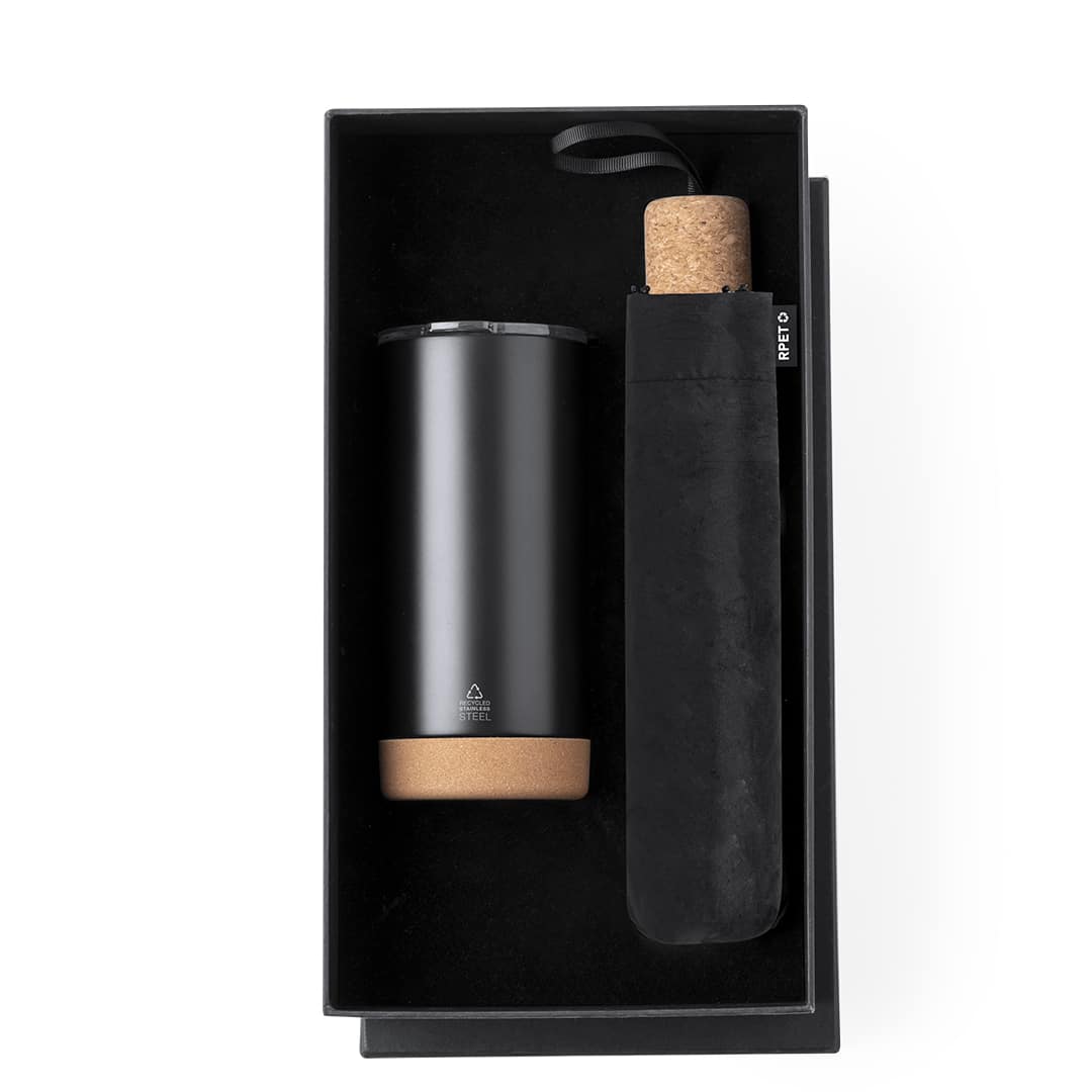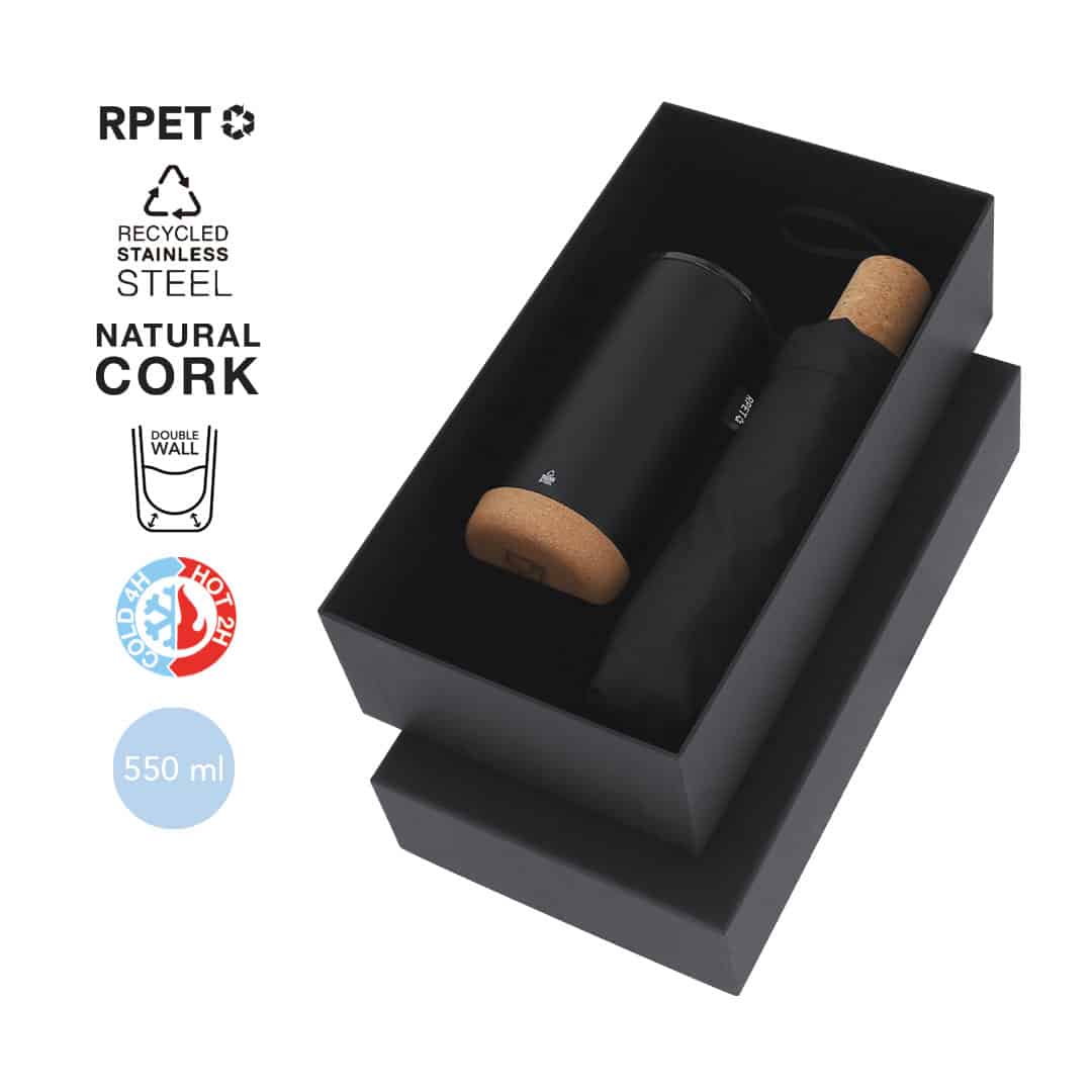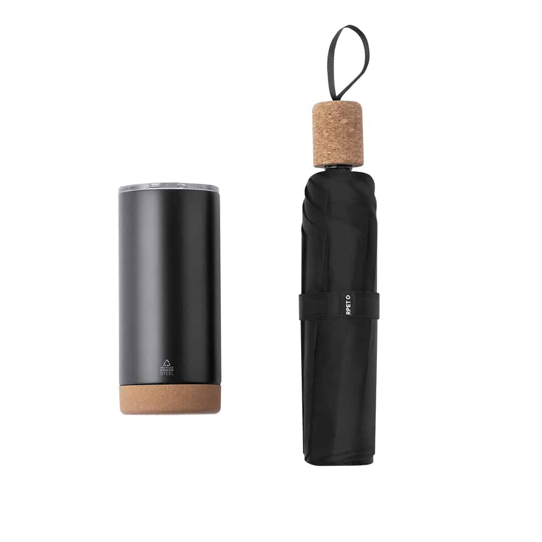 Descubre el Set Neolux, un elegante y sostenible set premium que incluye un vaso térmico de doble pared en acero inoxidable reciclado y un paraguas plegable. Ideal como artículo promocional y regalo corporativo, este set combina funcionalidad y estilo, perfecto para mostrar la imagen de tu empresa mientras cuidas del medio ambiente. Presentado en un estuche individual, es el regalo ideal para fortalecer relaciones comerciales y ofrecer a tus clientes una experiencia única. ¡Haz que tu marca destaque con este exclusivo merchandising promocional!