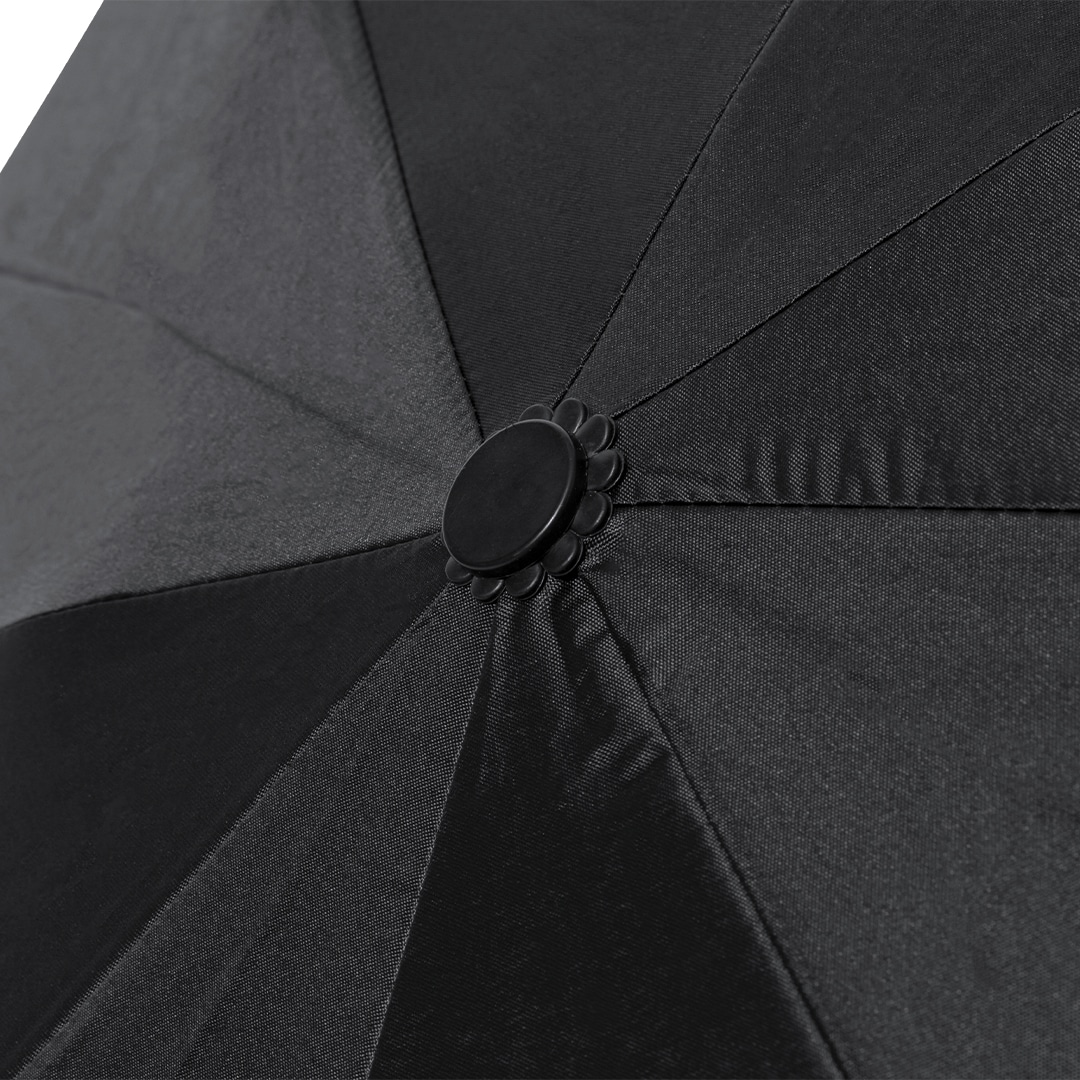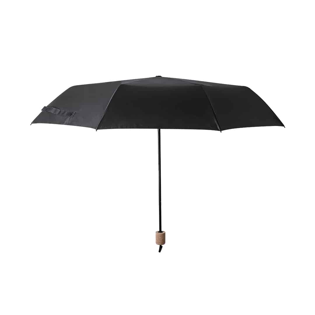 Composición: Paraguas Pongee 190T RPET. Varillas Fibra de Vidrio. 21". Sistema Antiviento. Mango Corcho. Funda Pongee RPET