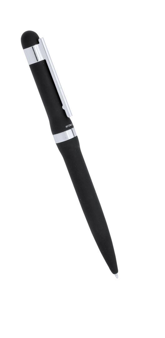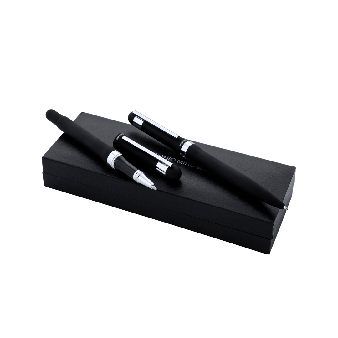 Elegante set de Antonio Miró con bolígrafo de mecanismo giratorio y roller de capucha y original anilla en sobrio diseño. De cuerpo metálico en acabado negro brillante con clip plateado. Presentado en elegante estuche individual en color negro con logotipo de la marca y funda. En tinta azul.