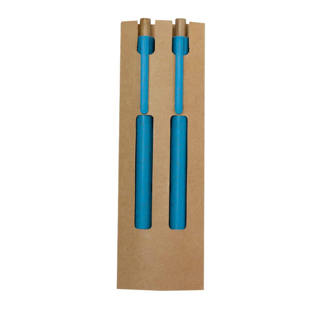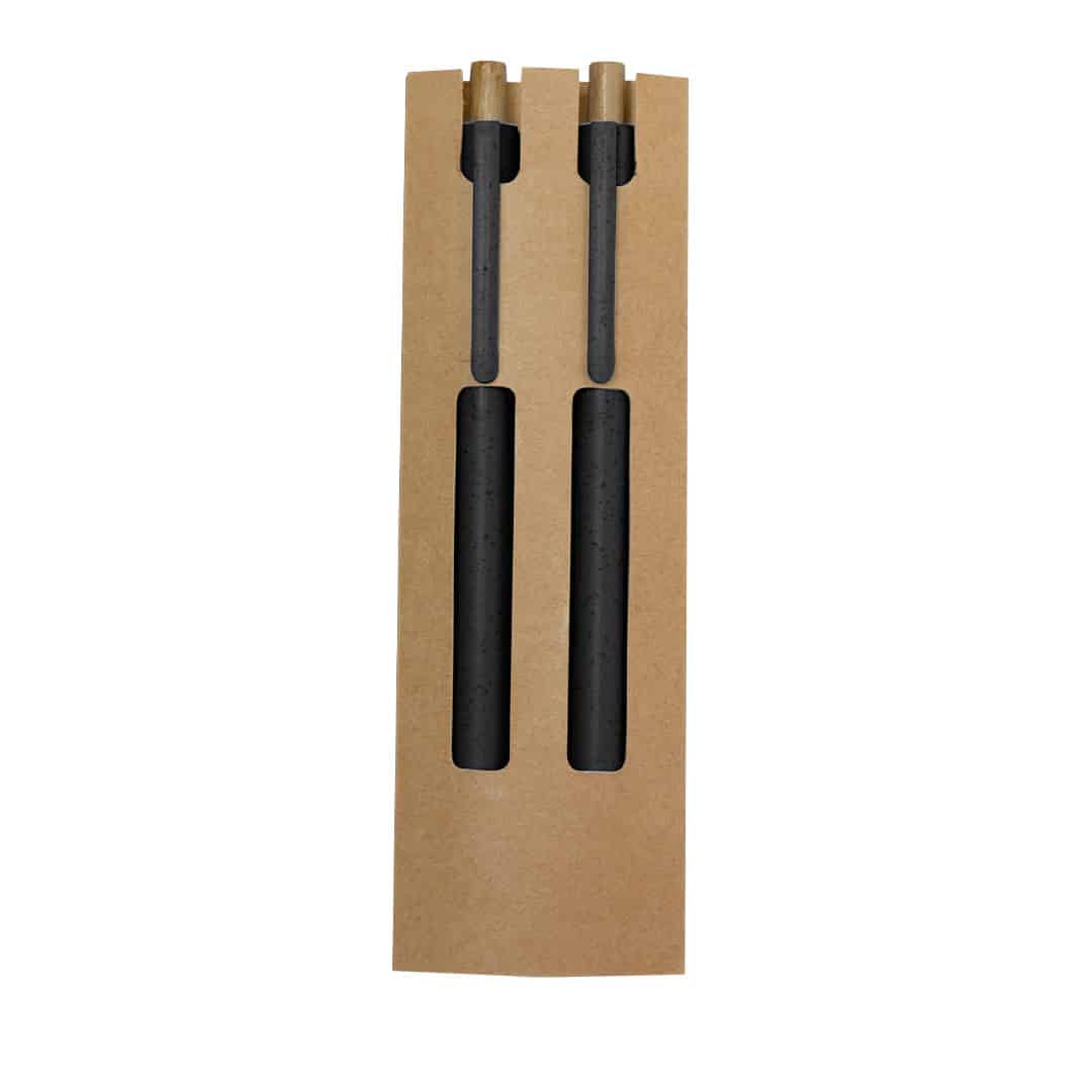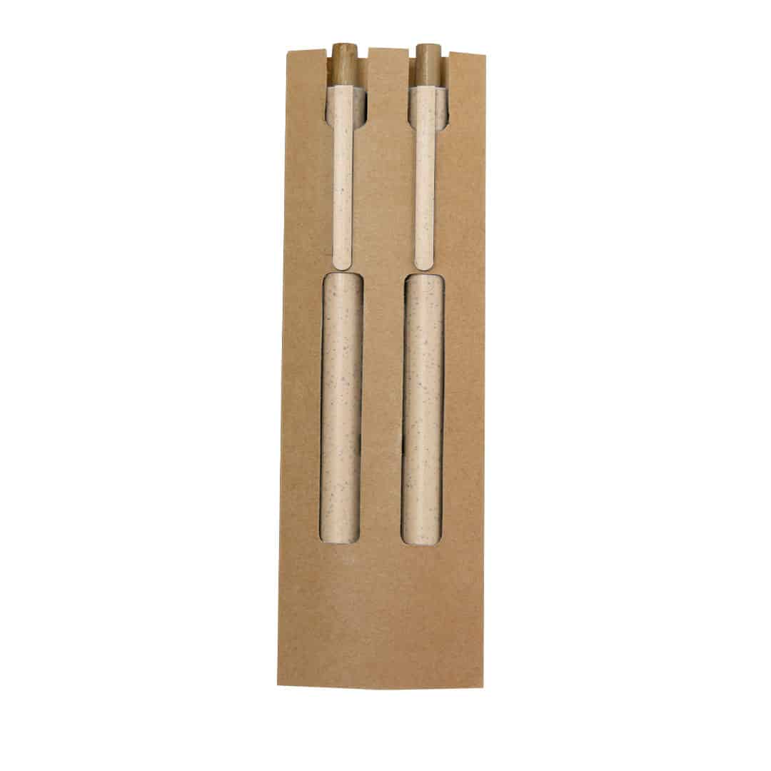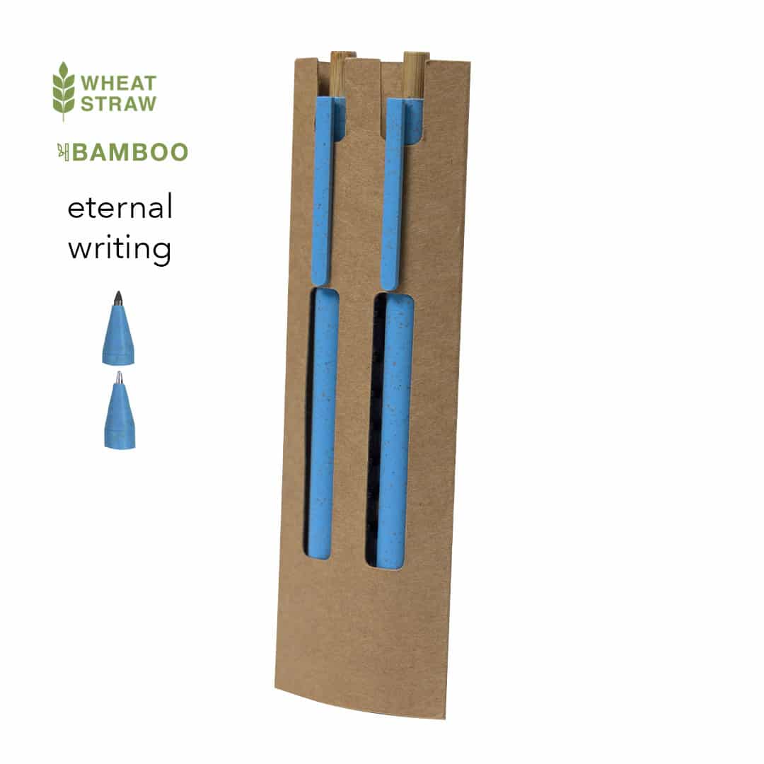 El Set Okafor es un exclusivo regalo promocional que incluye un bolígrafo y un lápiz eterno, diseñados con caña de trigo y bambú. Perfecto para merchandising publicitario eco-amigable, este set viene en un elegante estuche de cartón reciclado. El bolígrafo ofrece un mecanismo pulsador y tinta azul, mientras que el lápiz cuenta con una punta eterna que minimiza los residuos. Ideal para empresas que desean destacar con regalos sostenibles y personalizados.