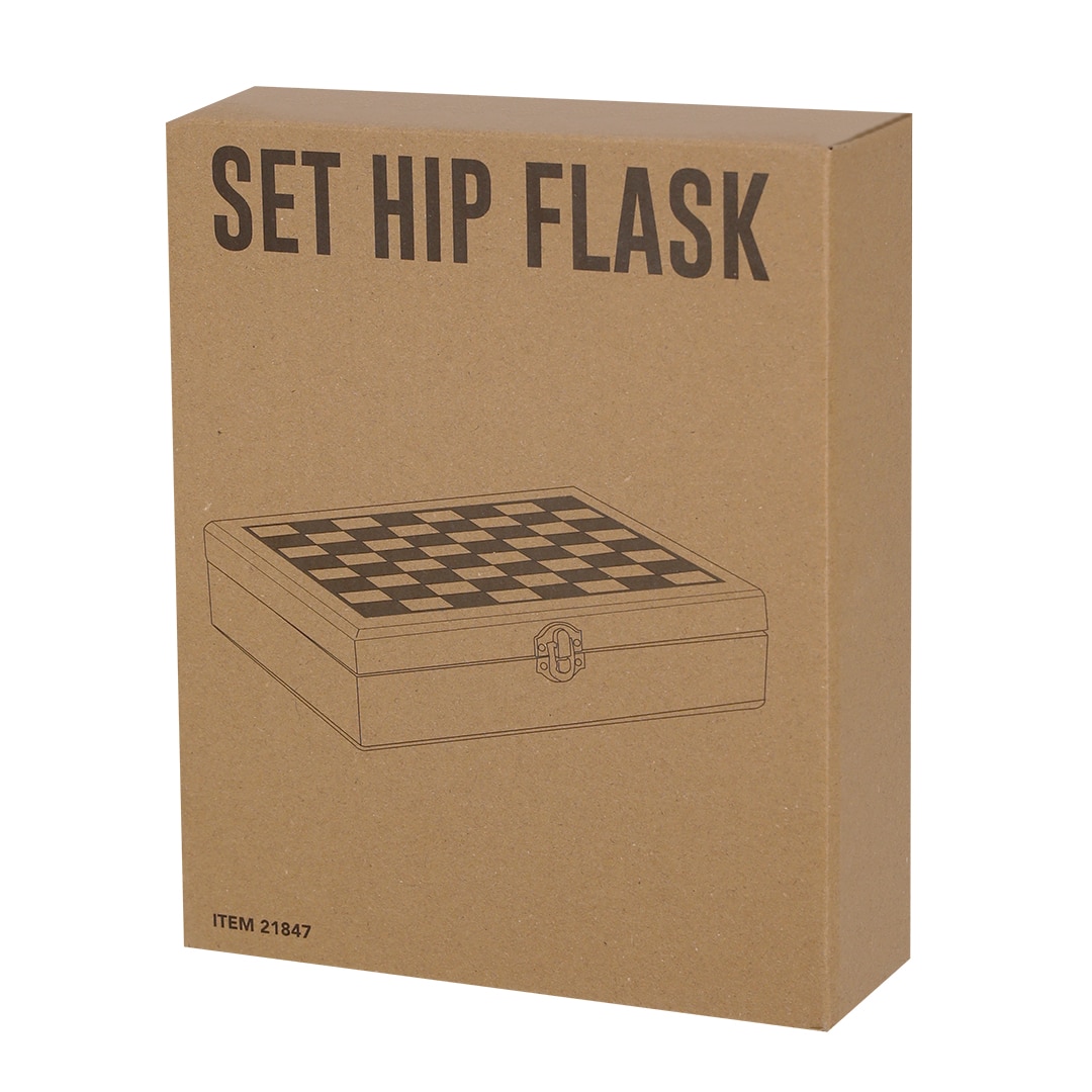 Descubre el exclusivo Set Petaca Menzie, un regalo corporativo ideal para los amantes del juego y la elegancia. Este set cuenta con una petaca de 220 ml en un acabado de madera con diseño de tablero de ajedrez, cerradura de seguridad y accesorios de acero inoxidable recubiertos en PU. Incluye un vaso de chupito, un embudo práctico, una baraja de cartas de póker y seis dados rojos. Todo presentado en un sofisticado estuche con un tablero de ajedrez y 32 piezas de ajedrez en colores beige y marrón. Perfecto para impresionar a tus clientes o empleados y fortalecer relaciones comerciales.