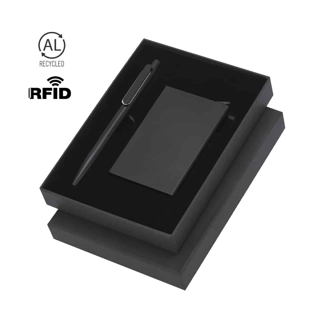 Descubre el Set Randolph, un regalo promocional ideal para empresas que valoran la sostenibilidad. Este elegante conjunto incluye un bolígrafo con mecanismo pulsador y un tarjetero con protección RFID, ambos fabricados en Aluminio Reciclado. Su enfoque en el reciclaje y el ahorro energético, junto con un diseño sofisticado, convierte a este set en una excelente opción de merchandising publicitario. Presentado en una caja negra refinada, es perfecto para fortalecer la relación con clientes conscientes del medio ambiente.