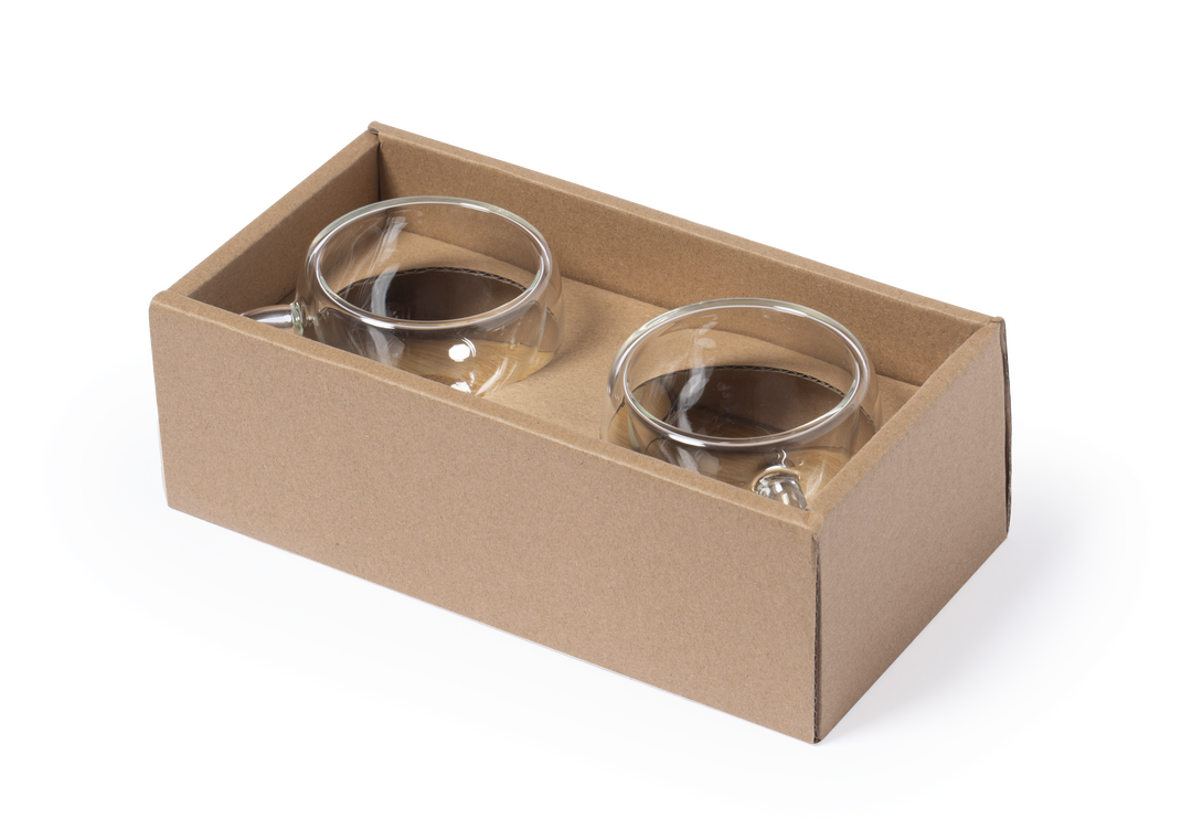 Otra Información: 2 Tazas Cristal Borosilicato 90 ml. 2 Posavasos Bambú
