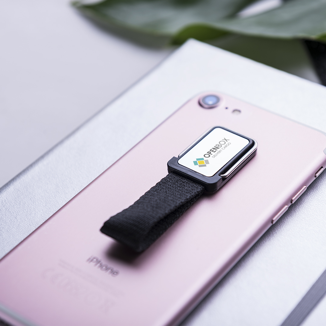 Original soporte adhesivo para smartphone con cinta para selfies en resistente poliéster y pastilla central para marcaje. Con soporte metálico y presentado en atractiva bolsita de diseño.