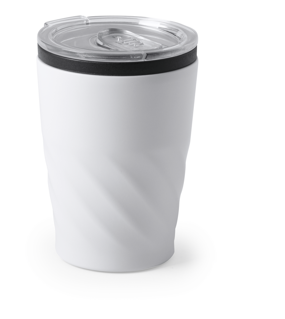 Vaso fabricado en acero inox de 350ml de capacidad. Cuerpo con diseño biselado, con anilla de color negro. Con original tapón dosificador transparente y abrefácil. Es ideal para tener en tu escritorio, mesa o en cualquier superficie donde disfrutar tranquilamente de tu bebida favorita.